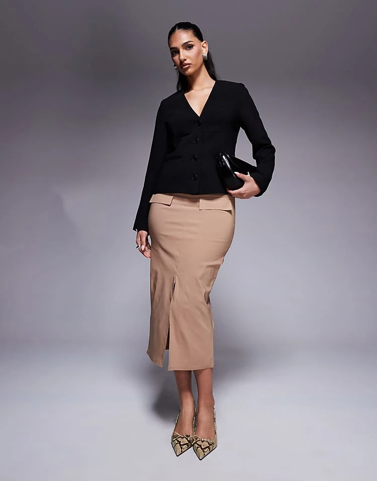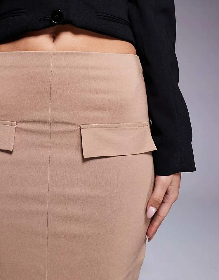 Be the first to review “In The Style Bengaline Structured Split Front Pocket Detail Midi Skirt In Camel For Women”