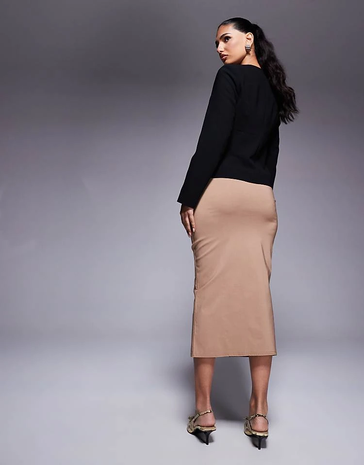 In The Style Bengaline Structured Split Front Pocket Detail Midi Skirt In Camel For Women