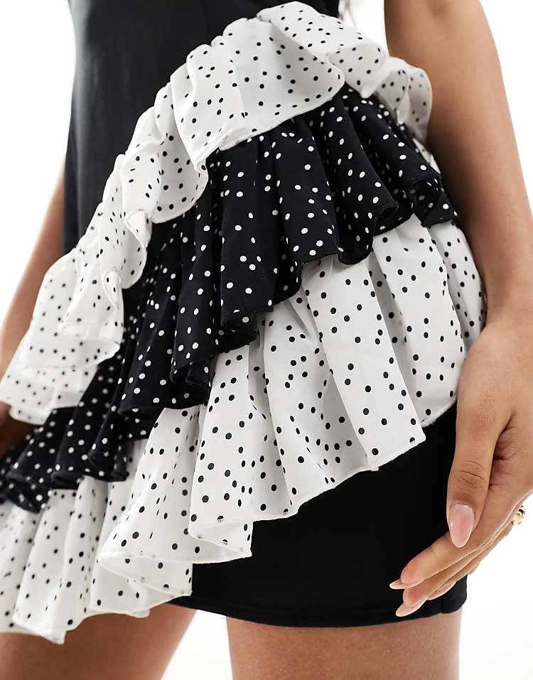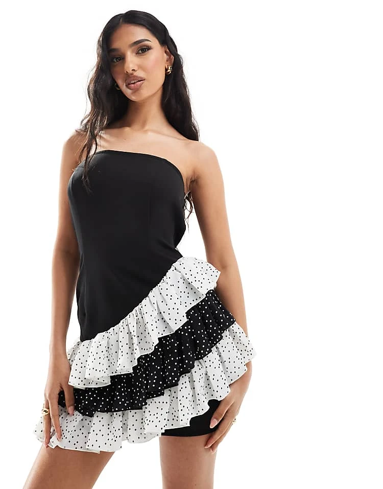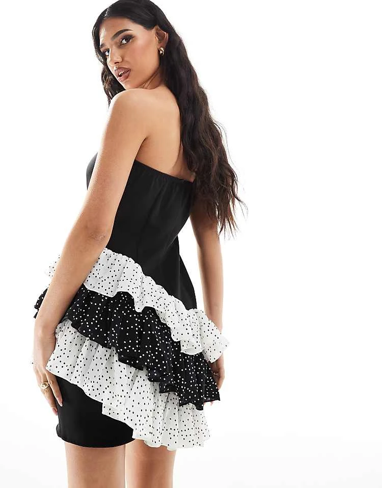 In The Style Exclusive Bandeau Dress With Contrast Asymmetric Polka Dot Trim In Black For Women Black/white