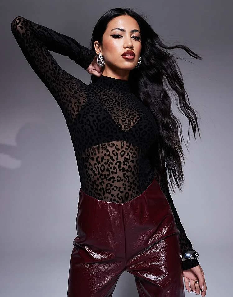 In The Style Exclusive Devore Long Sleeve Bodysuit In Black Animal For Women