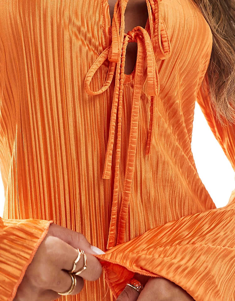 In The Style Exclusive Tie Front Plisse Mini Dress In Orange For Women