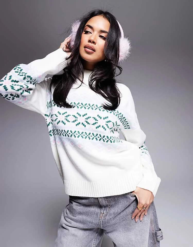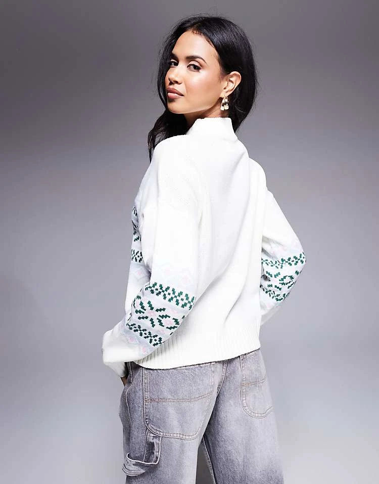 In The Style High Neck Jumper In Cream Fairisle Print For Women Cream Print