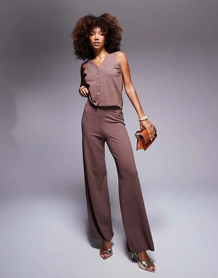 In The Style Knitted Button Through Waistcoat And Wide Leg Trousers Co-ord In Chocolate