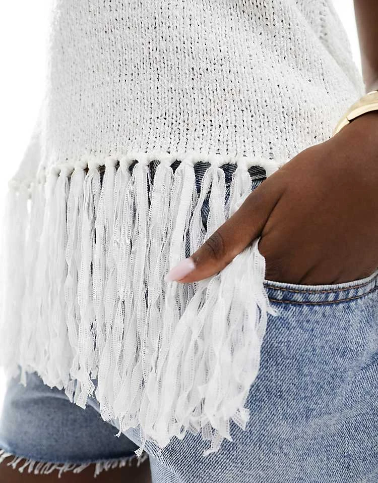 In The Style Knitted Sleeveless Tassel Hem Top In White For Women