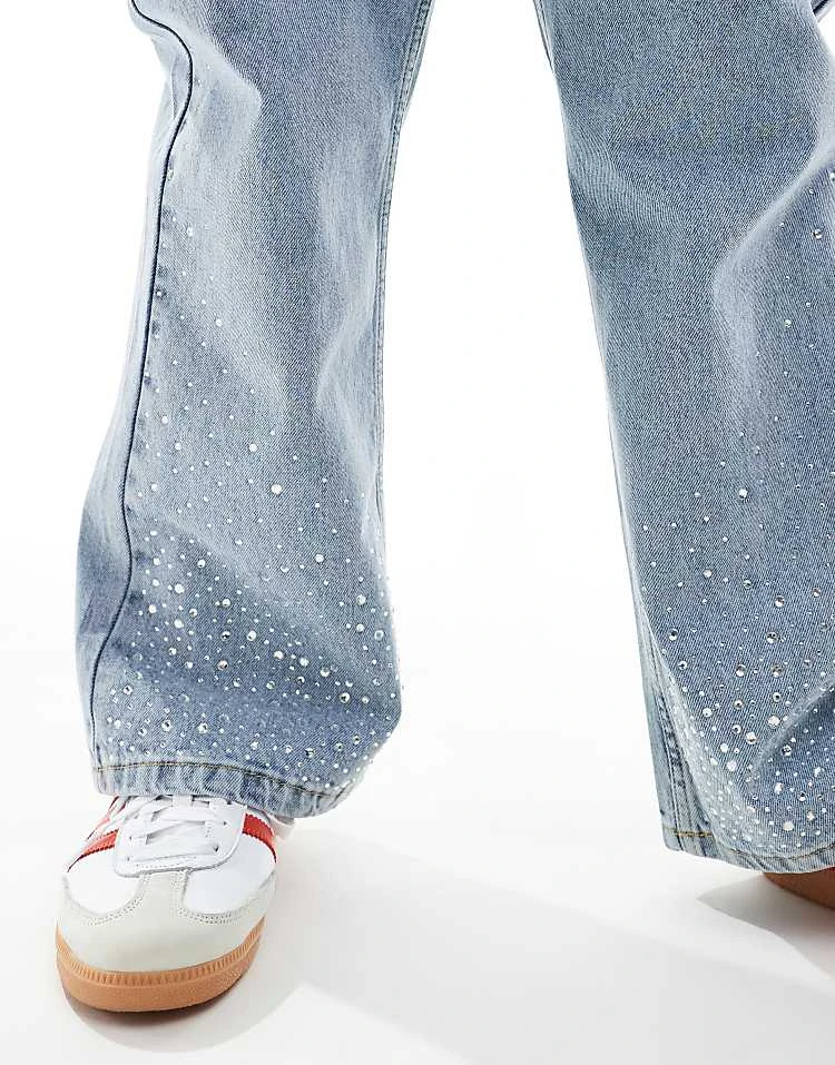 In The Style Plus Diamante Detail Wide Leg Jeans In Light Blue For Women