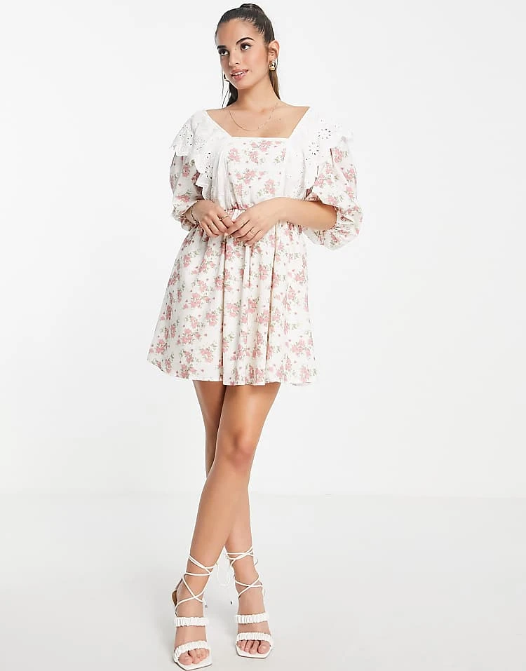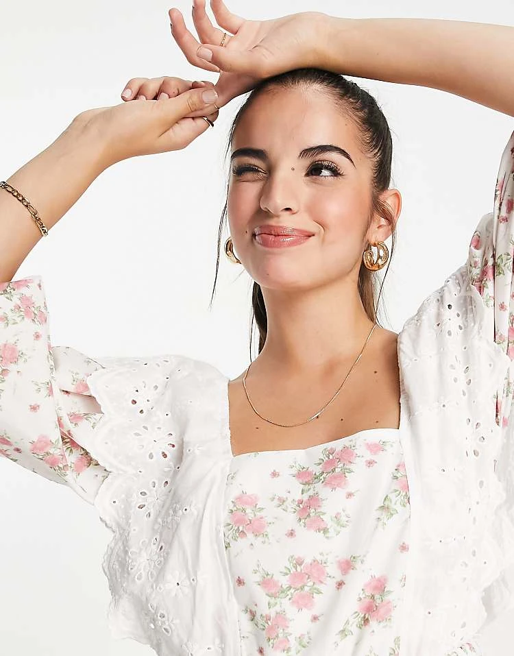 In The Style X Lorna Luxe Exclusive Trim Bib Detail Mini Smock Dress In Rosebud Floral Print For Women Multi