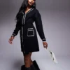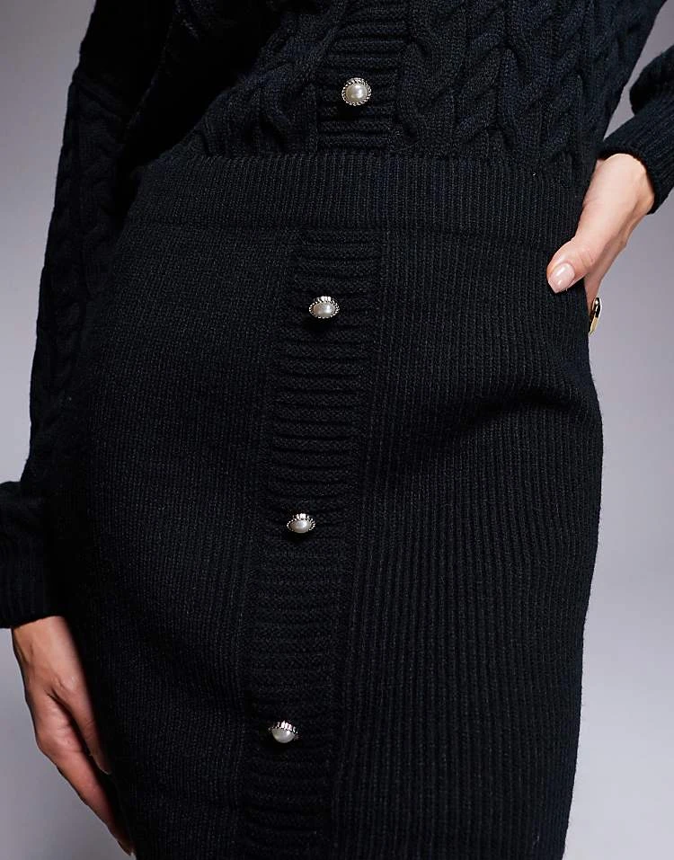 In The Style X Perrie Sian Cable Knit V Neck Diamante Button Mini Dress In Black For Women