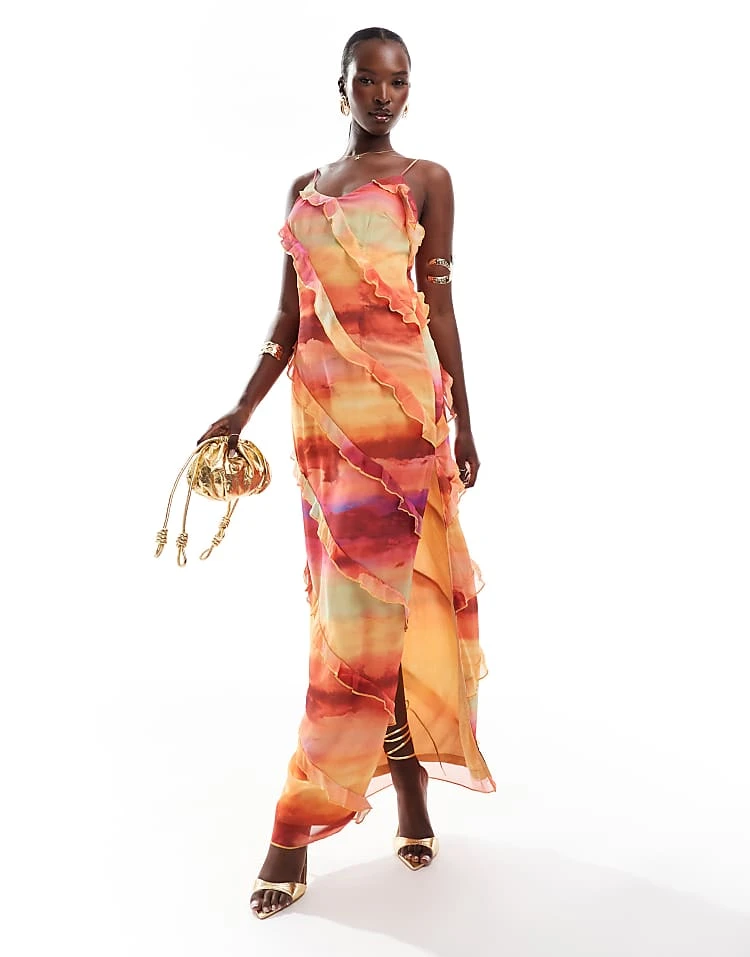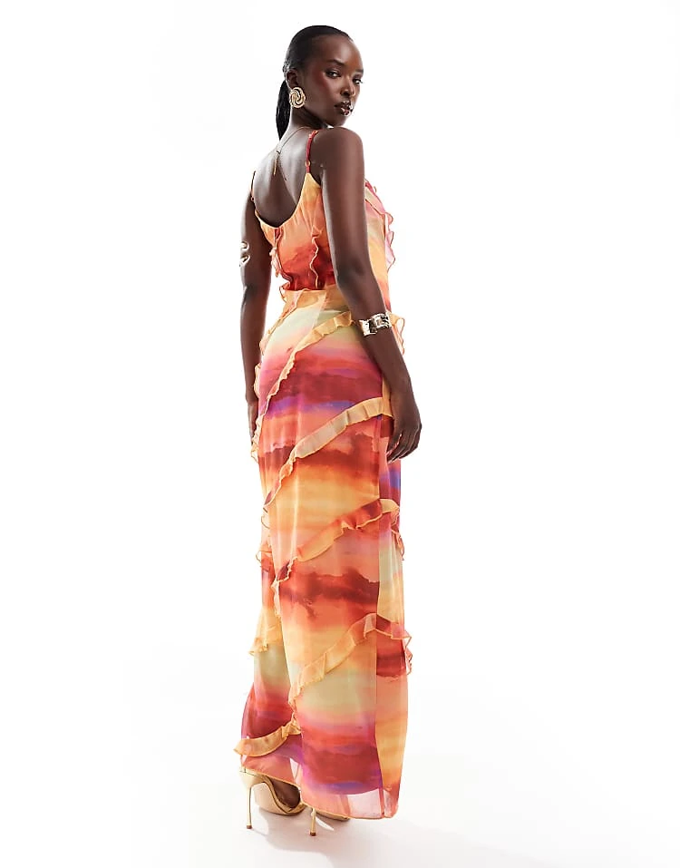 In The Style X Perrie Sian Exclusive Cami Ruffle Trim Maxi Dress In Orange Ombre For Women Multi