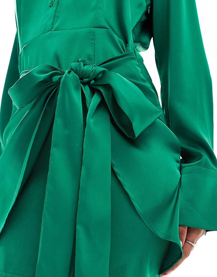 In The Style X Perrie Sian Exclusive Satin Wrap Tie Side Mini Shirt Dress In Emerald Green For Women