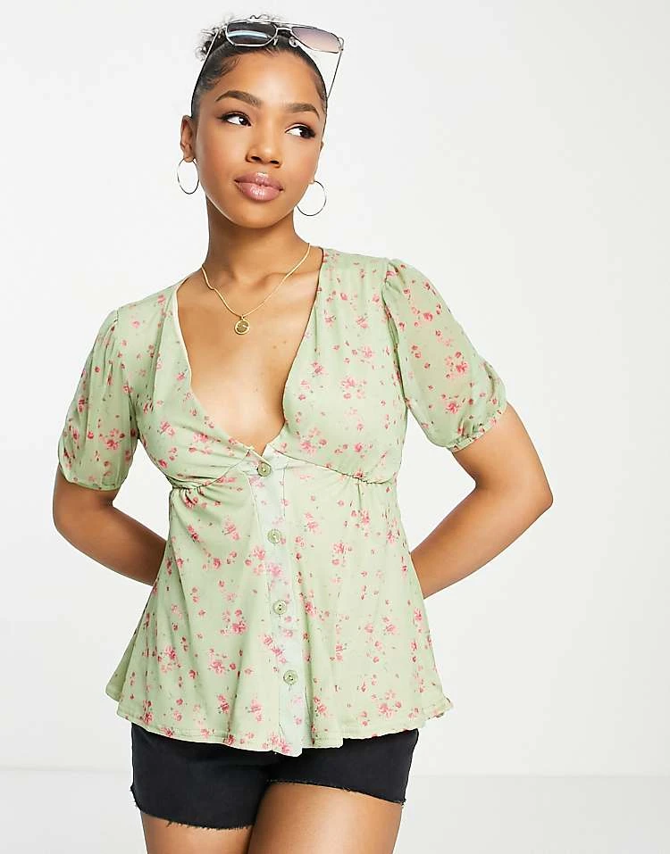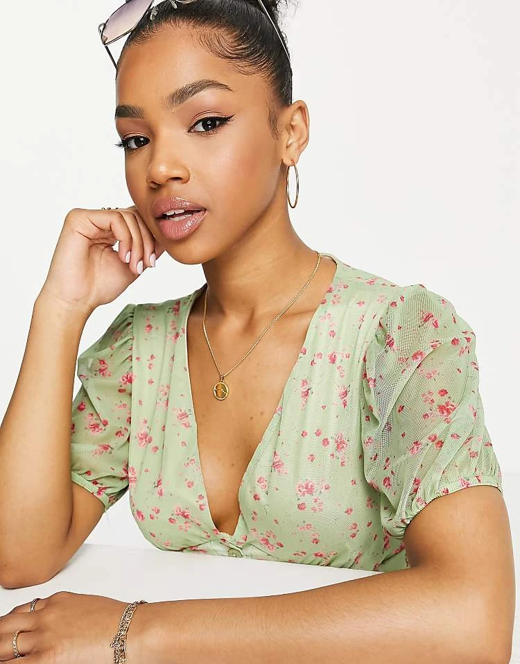 In The Style X Perrie Sian Puff Sleeve Button Front Blouse In Lime Floral Print For Women Multi
