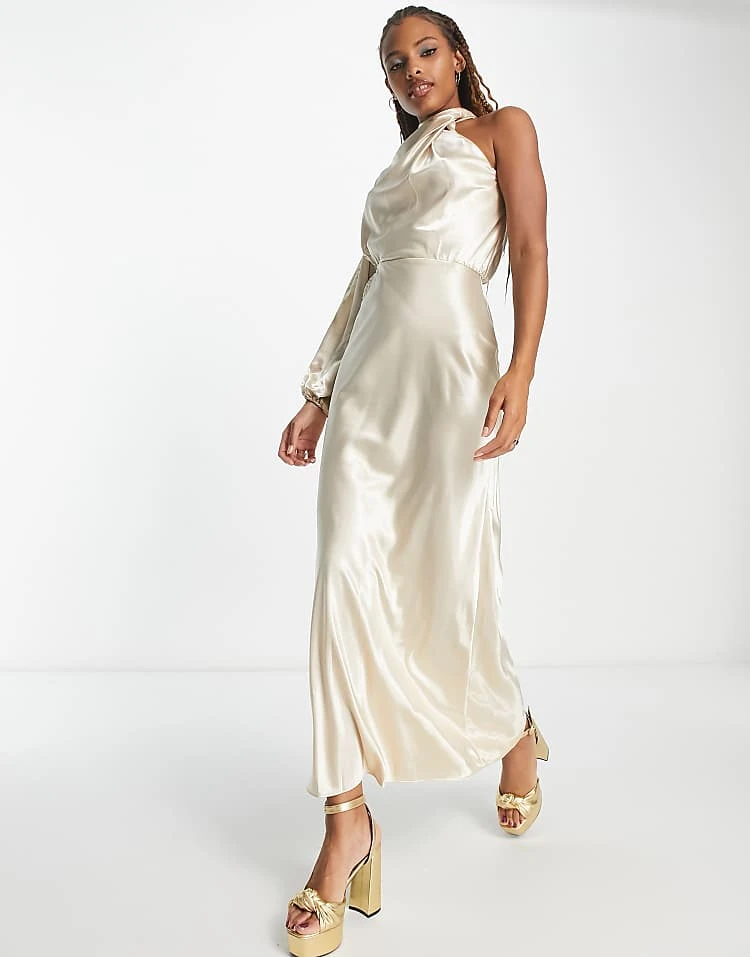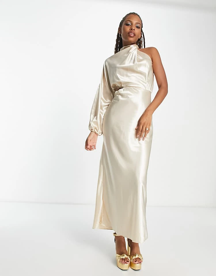 In The Style X Terrie Mcevoy Satin One Volume Shoulder Cut Out Maxi Dress In Champagne For Women
